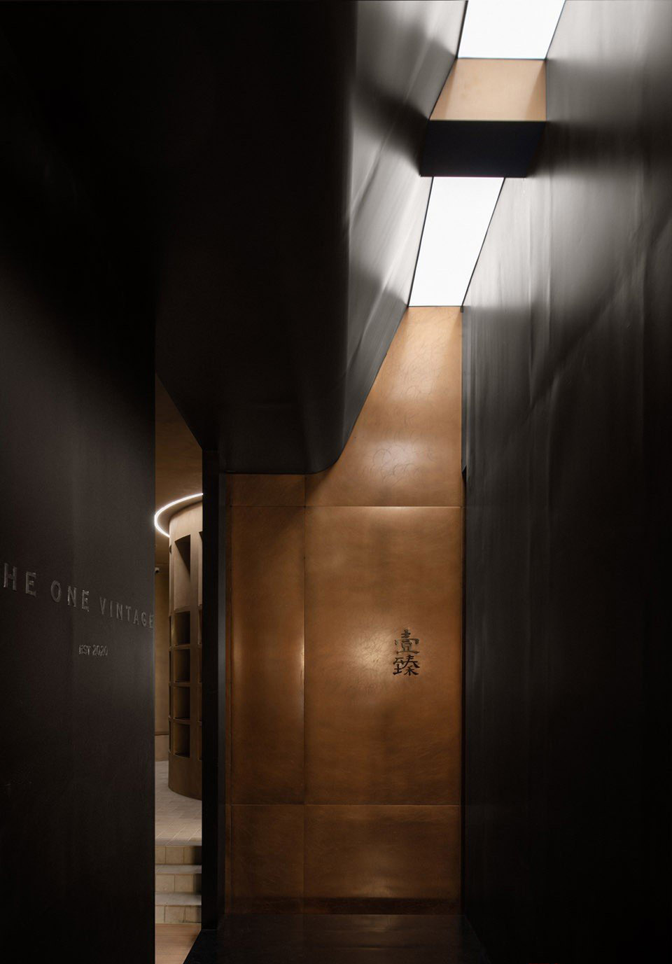 所以,室內(nèi)空間的規(guī)劃,是依托于消費(fèi)動(dòng)線與品牌認(rèn)知過(guò)程而展開(kāi)的構(gòu)思邏輯。首先,我們用一個(gè)狹長(zhǎng)的門廊通道將原空間分為了左右兩個(gè)空間物理關(guān)系。并在這個(gè)黑色立方體的末端設(shè)置了一面做舊的銅板墻體,設(shè)置這種色彩、質(zhì)感的目的,除了可以形成一個(gè)引導(dǎo)進(jìn)入的視覺(jué)關(guān)系外,其表面懸浮的壹臻logo,也是在通過(guò)某種心理暗示告訴到訪的客人,“我”的名字叫——壹臻。