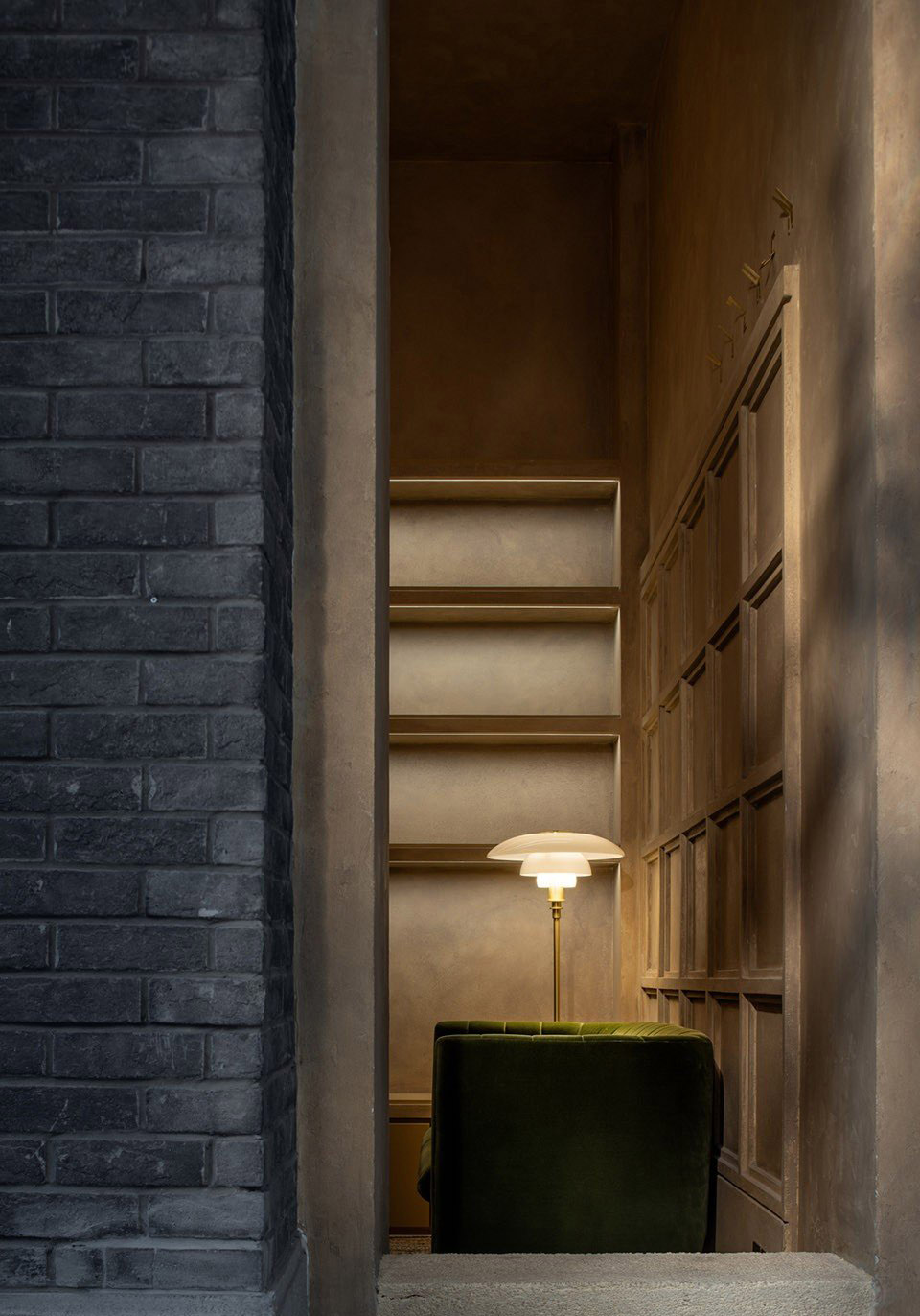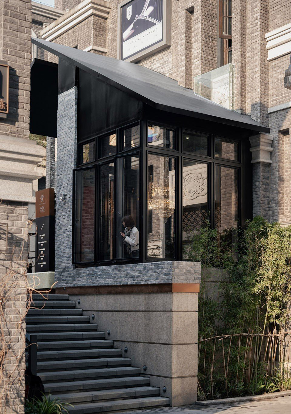 依托于可利用的建筑外擺區(qū)空間,我們?cè)诒WC原建筑不受破壞的前提下,進(jìn)行了大膽的外部空間拓展與規(guī)劃。在通過(guò)一系列建筑及景觀化的設(shè)計(jì)干預(yù)后,我們不僅為原建筑創(chuàng)造了可供休息、停留、甚至是遮風(fēng)避雨的外擺區(qū)域。同時(shí),亦從引流的角度,還為該物業(yè)創(chuàng)建了一個(gè)視覺(jué)中心,即一個(gè)與原建筑完美共生的鋼結(jié)構(gòu)玻璃小屋。在玻璃小屋內(nèi),我們運(yùn)用蒙太奇的處理手法,大膽且夸張的放置了一盞超大的復(fù)古水晶吊燈,這盞吊燈幾乎填滿整個(gè)小屋,在燈光的加持下,尤其引人矚目。