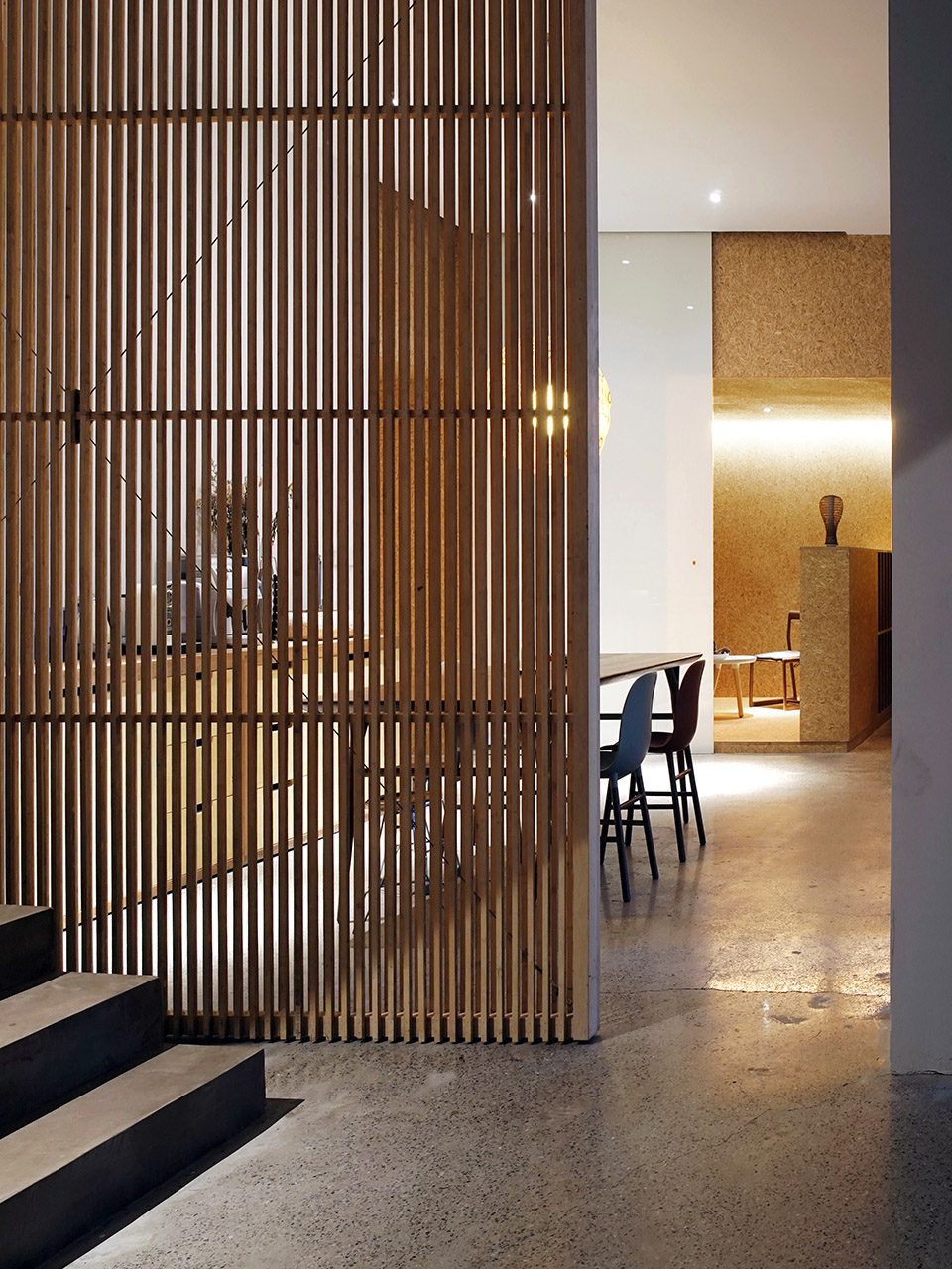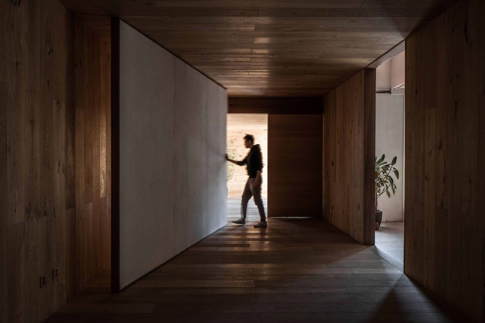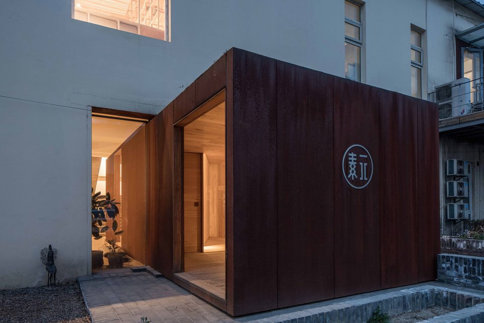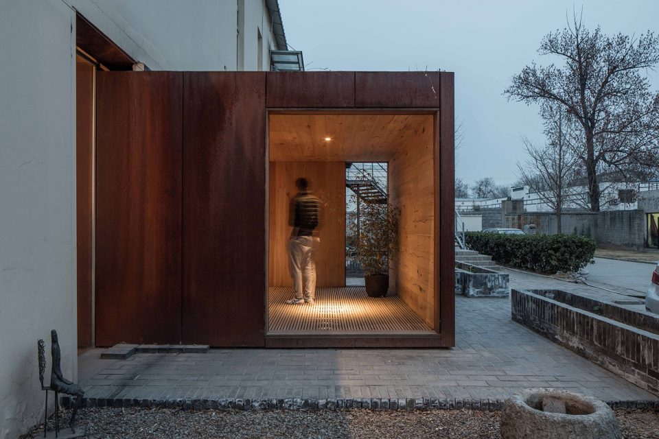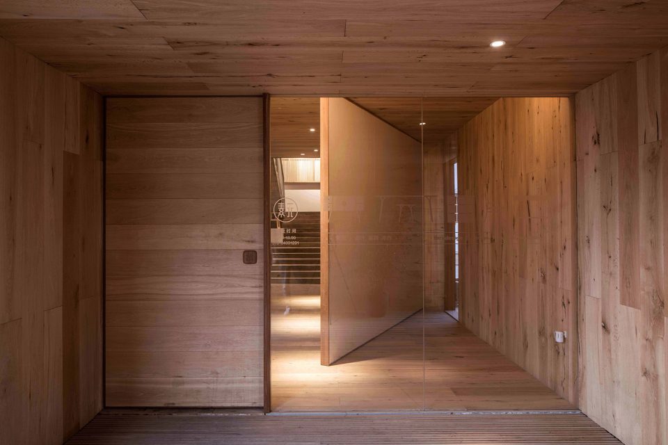 身體的每一次轉(zhuǎn)折都是探險(xiǎn)。房子內(nèi)外的連接,通過耐候鋼板箱體的置入完成。從視線交接到進(jìn)入房子內(nèi)部,經(jīng)過四次轉(zhuǎn)折。箱體內(nèi)具有重量感的平開木門和可旋轉(zhuǎn)毛氈面板木墻,使各處遞進(jìn)之中又帶有停頓的留白。旋轉(zhuǎn)木墻可切換不同的使用場(chǎng)景,進(jìn)入、展示、沙龍。路徑的多重定義讓房子充滿不確定的機(jī)關(guān)。
